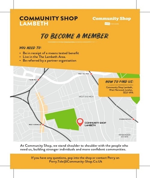 - Community Shop Lambeth, West Norwood, London, SE27 9PA Home | The Company Shop Group. The shop has been in West Norwood since 2016 and is the second oldest of 10 Community Shops across the UK.