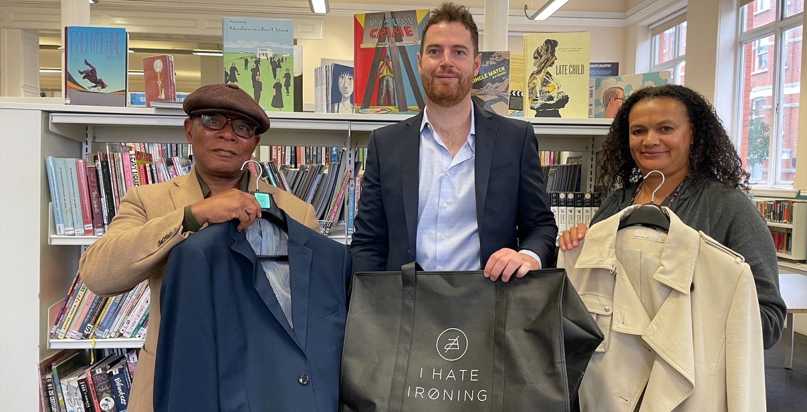 L-R – Cllr Donatus Anyanwu, Matt Connelly of Ihateironing, Librarian Abibat Olulude at the relaunch of the Workwear borrowing scheme